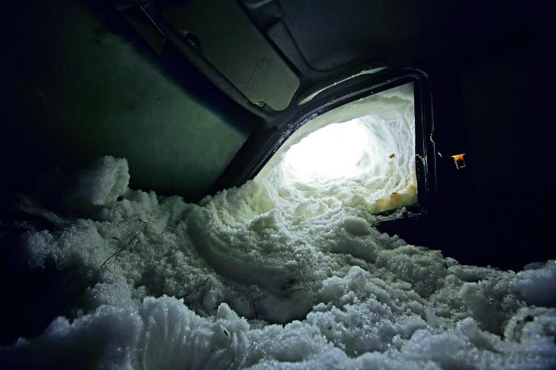В машине трое: фотограф, видеооператор и собственно «потерпевший». Над крышей уже метра полтора плотного снега – настолько плотного, что по нему можно ходить, нисколько не проваливаясь. Связь с «погребенными» только по рации, ведь снег – отличный звукоизолятор. Кстати, мобильный телефон под двухметровым слоем снега работает ничуть не хуже, чем на поверхности. С момента, когда машина полностью скрылась под «лавиной», прошло около 20 минут, а с «того света» передают, что воздуха уже маловато, пора пробовать спасаться – рыть туннель на волю.