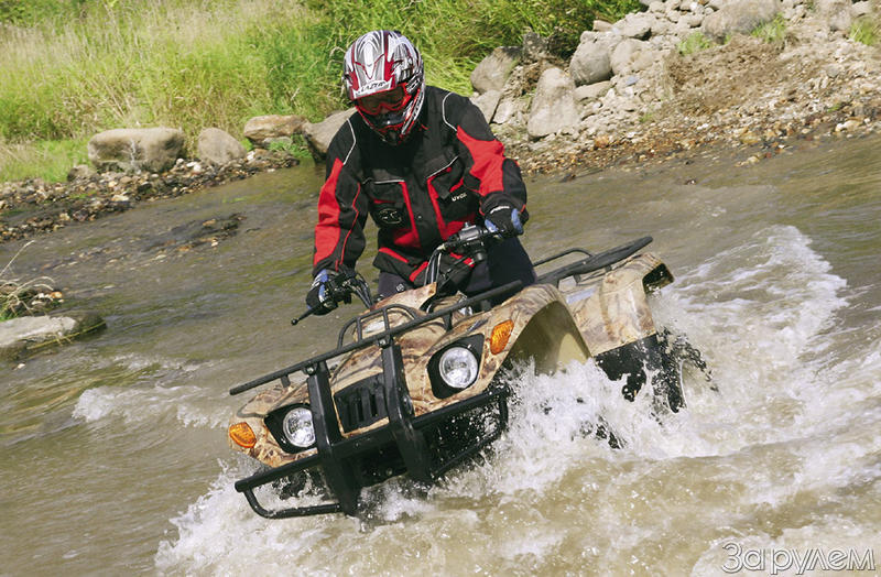 В аппарате ничего удивительного, все на своих местах. Электростартер продублирован ручным – как на снегоходах и многих фирменных ATV. Трансмиссия – классическая для большинства полноприводных «всепролаз»: карданные валы соединяют трансмиссию с обоими мостами, передний мост – с дифференциалом. Коробка передач – 5-ступенчатая, с автоматическим сцеплением, символы на рычаге переключения передач показывают, что имеется и задний ход. Тормоз – барабанный, он один и установлен на правой оконечности оси. Привод тормоза – тягой от педали, а также тросом от «ручника» на левой рукоятке руля. Конструкция передней подвески простая и надежная – двухрычажная, с амортизаторами. Она чаще всего применяется на утилитарниках, именно потому, что проста и надежна и не ухудшает проходимость машины. Вижу средства регулировки преднатяга пружин (в пяти положениях) на всех трех амортизаторах – они понадобятся, если загрузить квадр по полной: 40 кг – на передний багажник и 80 – на задний. По опыту общения с «Пумой» знаю, что подвески – слабое место аппарата: когда-то задний амортизатор «самоустранился» от работы после 800 км пробега. Можно ли рассчитывать, что здесь они надежнее?