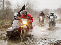 Я ехал в "белой" команде (у каждой был свой цвет) в коляске оппозита компании "Урал-Рус". Попетляв по окраинам Ярославля, выбрались к берегу Волги. Грунтовка предательски кончилась - пошли "пампасы". Форсирование грязевой пропасти для многих не прошло бесследно: один менял порванную резиновую муфту, другой лихорадочно нацеплял кроссовую резину на ведущее колесо - понимал, снисхождения от распутицы не жди