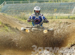 Первые несколько кругов кроссовой трассы прохожу на нем, старом знакомом, прекрасно себя зарекомендовавшем. Мощный двигатель в тандеме с автоматическим вариатором легко разгоняет тяжелый квадр. Достаточно чуть нажать на ручку газа - и из-под колес с крупными грунтозацепами вылетают комья земля и грязи. Двигаюсь на заднем приводе - ATV ведет себя как кроссач: легко и предсказуемо пускается в управляемый занос и позволяет подруливать, не требуя приложения чрезмерных усилий. Однако, когда включаешь полный привод (что можно сделать, не останавливаясь - нажатием на кнопку на правом рулевом пульте), ATV тут же демонстрирует "медвежий" нрав: как только добавил газ в повороте, Grizzly попытался "выбить" руль из рук. В режиме AWD на жестком грунте "зверь" желает двигаться только прямолинейно, так что огромных человеческих усилий требуют попытки заставить его поворачивать. Он измотал меня окончательно, за это я его заглушил на стоянке. И принялся изучать особенности новой модели.