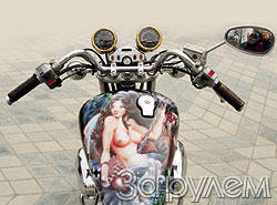 Молодая была уже немолода. Но природа одарила ее щедро!** Бензобак форм рубенсовских женщин расписан потрясающей аэрографией. Сюжет картины таков. Неземной красоты фемина-русалка смотрит томным взглядом вдаль. В ее руках посох, инкрустированный маленькими дельфинчиками. Возле хвостатой красавицы замер волшебный карп, охраняющий Ее Высочество. (Еще один карп выполнен с помощью тиснения на коже эксклюзивного сиденья.) Дополняют картину аэрография на боковых крышках ниже седла, золотые ободки на стаканах приборов, кожаные чехлы на рукоятках руля и традиционное обилие хромаѕ Но мы же не в церкви, господа! Ближе к телу!