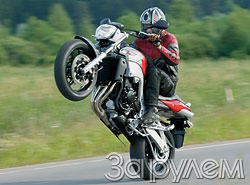 А он и не располагал к дерзости. Его просто чувствовать: лучше всего ему в скоростном диапазоне "с четырех до девяти"ѕ Но вот эйфорию от гармоничной динамики разгона из меня выдуло потоком встречного ветра: после 140 км/ч ощутил, что давит в грудь. Почувствовал себя уже не пилотом, а тормозным закрылком. Впрочем, глупо при полном отсутствии атрибутов заслона ждать хотя бы намека на ветрозащитуѕ Комфортный скоростной диапазон я уяснил. Теперь попробую познать, как эта машинка рулится. И повторил разгон. Резко открыл газ на первой передаче, и тут что-то меня дернуло - взял, да и сыграл сцеплением. Переднее колесо вмиг взмыло в воздухѕ Так, еще газку - и уже держу мотоцикл в балансе. Едем в полноценной "свече"!.. Ты, выходит, можешь и так?! Н-да, теперь тебя понимаю: зубаст ты, братец.