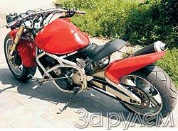 Рама из труб окружает рядный 4-цилиндровый двигатель мощностью 152 л.с. Чтобы сформировать нужную посадку, пришлось удлинить базу до 160 см. Руль drag-bar и вынесенные далеко вперед подножки сделали посадку не только "правильной", но и удобной. Угол наклона передней вилки получился совсем не острым - он подбирался опытным путем, а критерий - совсем не эстетические соображения, а исключительно удобство водителя. Аппарат ведет себя на ямах и ухабах не как стрит, а скорее как эндуро - "утюжит" неровности дороги, практически не беспокоя ездока.