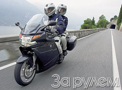 В тот же выставочный день Миланского мотосалона в соседнем павильоне свой флагманский спорт-турер продемонстрировала и немецкая BMW. И в нем за основу взят уже известный мотоцикл: K1200GT создан на той же базе, что и спортбайк K1200S и родстер K1200R. Поперечный 4-цилиндровый двигатель установлен в алюминиевой диагональной раме с большим наклоном вперед, экзотическая передняя подвеска Duolever сочетается с уже традиционной для BMW задней подвеской Paralever (на которую система Moto Guzzi CARC ну очень уж похожа). Двигатель слегка дефорсирован - со 167 до 152 л.с. - с тем, чтобы повысить гибкость его работы: 100 Н.м крутящего момента он выдает в диапазоне от 2 700 до 10 000 об/мин. Мотоцикл оборудован частично интегральной тормозной системой (от рычага на руле срабатывают тормоза обоих колес, от педали - только задний) с АБС. В стандартное оснащение входит электронный иммобилайзер, а уж список заказного, в традициях BMW, "чего только душа не пожелает". Вот только самое существенное: система регулировки параметров подвески на ходу (называется ESA), бортовой компьютер, который показывает даже уровень масла в силовом агрегате, система оповещения о падении давления в шинах, подогрев рукояток руля, навигационная система, круиз-контроль, сумка на бензобак. Мотоцикл можно приспособить для седока любого роста: седло регулируется по высоте в пределах 820-840 мм (можно заказать и 800-820 мм), электроприводом регулируется высота ветрового стекла (опять-таки, хошь - закажи стекло на 60 мм выше), на 40 мм переставляется по высоте руль.