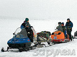 Порыв ветра донес многоголосый лай собак: на подходе наши компаньоны по походу. Поехали к ним навстречу, но тут произошла первая поломка - у "Тайги" "крякнула" коробка. На одометре снегохода 2500 км - критический пробег для этой модели: если до него узел дожил, значит, будет "Тайга" ездить долго и счастливо. Но многие не доживаютѕ У первых моделей вообще редкая коробка переживала такой пробег. В последующие устанавливали импортные подшипники фирмы SKF - и дело наладилось. Похоже, наша машина еще со старыми комплектующимиѕ Пока "труп" буксировали к берегу, размышлял: может, попроситься в компанию к собаководам - с ними надежнее?