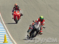 Кстати, о мотоцикле. Кроме гоночного пластика, отсутствия световых приборов и зеркал, он оказался абсолютно стандартным, даже тормозные шланги на нем "родные" - резиновые. Как инструктор и предупреждал, он вел нашу "сцепку" три круга, постепенно увеличивая темп. Убедившись, что я успеваю за ним без затруднений, по окончании третьего круга дал понять, что веду теперь я - и отстал. Еще через несколько кругов первая учебная сессия закончилась - учитель жестом пригласил свернуть на пит-лейн. Оказалось, то, что я долго не практиковался (незадолго до курсов в гоночной школе я упал, и пришлось зализывать раны), сказалось на езде не лучшим образом. Во-первых, сообщил инструктор, в первом же повороте после старта я выбрал неверную траекторию, и эта ошибка сказалась в двух других, следующих "в сцепке" виражах. Во-вторых, я не адаптировал стиль езды к мотоциклу и треку (точнее к его первой - "струящейся" части): в некоторых поворотах передерживал аппарат в наклонном положении, а в других ехал в откровенно "литровом стиле" (этот стиль еще называют "point-and-squirt" - "направил и выстрелил"). Что, опять-таки, испортило линии прохождения поворотов. Причина - глаза "забыли", как считывать и запоминать трекѕ Плюс почти два года езды только на "литрах", а мощность этих монстров избаловала меня вконец. Особенно это почувствовал именно в закрытых перепадами высот поворотах, где ошибка становится очевидной только тогда, когда слишком поздно что-либо корректировать.