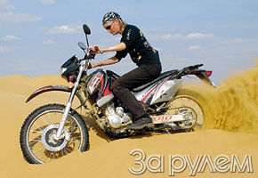 Сажусь за руль. И сразу отметил, что он, хотя и "косит" под спортивный, не удобен - слишком прямой, так и хочется чуть выгнуть его оконечности на себя. Зато оценил малую высоту седла. Это понравится не только низкорослым водителям. Во внедорожных ситуациях (кроме чисто кроссовой езды) полезно обладать возможностью дотянуться ногами до земли. К сожалению, плата за подобную уверенность - весьма скромный ход подвесок, а значит, потеря части удобст при езде по "злому" бездорожью. Так что называть 200GY полноценным эндуро не стал бы.
