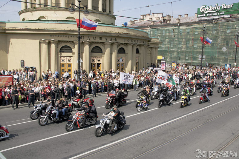 Невский проспект иногда полезно взлохматить: ему, чинному-благородному, встрепенуться – только на пользу. Тем более в такой-то праздник, День города Санкт-Петербурга. А чем лучше, как не ревом моторов, разбудить великий град от дремы?.. Праздничное шествие по Невскому удостоилась открыть – честь-то какая! – колонна мотоциклистов... Нет, то была колоннища! Гигантским рычащим драконом с огромным хвостом она выползла из «засады» на главную улицу северной столицы с примыкающей к ней Лиговки (хорошо, что местом сбора мотоциклистов избрали Лиговский проспект, а не какой-нибудь переулок, а то ведь звали приехать 200 двухколесных, а собралось около 700!) и по освобожденной от автомобилей улице на всех газах – к Дворцовой площади. Разодеты по-карнавальному – каких только персонажей тут не встретишь! А вон там, не сам ли Петр Великий в треухе пожаловал на мотоцикле? (Впрочем, читатель, сам рассмотри все на фотографиях...) Где-то на месте переднего клыка громоподобной пасти колонны-«дракона» за рогатым рулем вице-губернатор Питера Сергей Тарасов, без галстука. Встал с седла, чтобы поприветствовать хозяйку – губернатора Валентину Матвиенко. А за его спиной уже разразилось разгуляйство питерских стант-райдеров: они и на переднем колесе, и на заднем, и на моциках, и на скутерах, и крутили на асфальте кренделя, и, не жалеючи, жгли резину... Завели народ, изумили древний Казанский собор!.. Подтянулась платформа со сценой, на ней театр «Лицедеи» с милыми душе узнаваемыми масками-физиономиями. Когда, глядишь, подъехали трактор, автовышка, другие громыхалки, да не простые, а тоже в «карнавальных костюмах»: не замызганными чернорабочими – до последней гаечки, аки лебеди, в белоснежных перьях. Да что там – белее лебедей. Это ж для анекдота – «Беларусь» в перьях!.. Пушки в небо палят – из жерл вспархивают заряды резаной фольги, разлетаются по ветру, сверкают на солнце побогаче фейерверка, падают на головы заведенных питерцев, заполонивших тротуары Невского... Праздник разгорелся! А раз так, мотоциклисты, напоследок выловив в толпе горожан мальцов и раздав им сладости, удалились восвояси. Направили колеса в гостиничный двор отеля Ольгино на окраине города – чтобы допраздновать по-своему, не приглушая голосов и эмоции, но и чтобы другим питерцам не помешать гвалтом, прямотоками и сабвуферами со сцены. Вот ведь, организаторы – Werewolf MC, как истинные петербуржцы, предусмотрели все, даже такие мелочи.