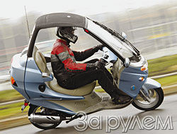 Пока мотор прогревался, разобрался со стандартными элементами управления, переключился на "мульки" - их тут предостаточно: хочешь, чтобы у аппарата "сорвало башню", отстегни две клипсы на верхнем краю лобового стекла - и сложи крышу в багажный кофр. Кофр ("по совместительству" он еще и спинка сиденья) очень большой: даже со сложенной крышей в него влезет шлем-интеграл и нетолстый портфель с документами. Что у нас тут еще? Дворник с омывателем хорошо очищает стекло от капель и грязи, жаль он без функции автоматического принудительного "укладывания" в крайнее положение: приходится ловить момент, когда щетка ляжет - и тогда нажимай красную кнопку на правой ручке руля. В большие бардачки по бокам от рулевой колонки без труда влезет - это чтобы вы оценили объем - десяток мобильников в каждый. Посокрушался, что на тестовом экземпляре нет магнитолы с МР3-"сидюком" (хотя колонки и установлены): дилер обещает, что она будет на всех "Чизетах"… Придется поверить... Освоился на мягком удобном кресле. Моторчик, сделанный по лицензии Yamaha, тихонько тарахтит, вибраций почти нет. Хочу заметить, что при росте водителя выше 182 см шлем упирается в крышу.