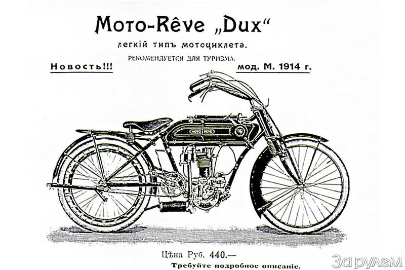 Забавно, что степень «натурализации» играла не столь уж решающую роль. Сколько угодно тому примеров: ввозили автомобили или мотоциклы, не меняли в них ни одной гайки, но приклепывали на машины свое клеймо. Или обратный вариант – развивали полностью независимое производство, однако сохраняли в названии память о происхождении изделия. Пример: английский Daimler уж сотню лет не поддерживает никаких связей с немецким Daimler, а имечко-то осталосьѕ И третий путь. Упомянутый уже москвич Юлий Меллер в 1909 году развернул производство мотоциклов, используя узлы швейцарской компании Moto-Reve. А назвал свою технику таким образом, чтобы никому не было обидно: Moto-Reve-Dux.