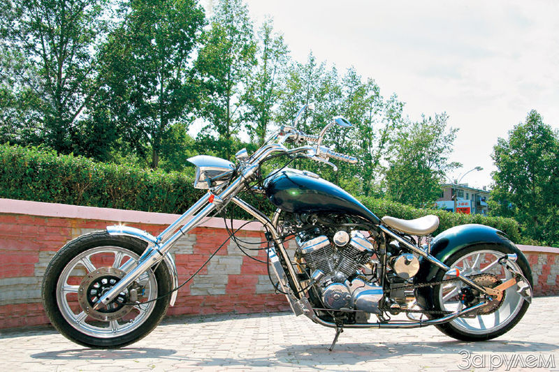 Из нержавеющей трубы смастерил в одном стиле ручки руля и подножки. Педальные узлы тоже самодельные и тоже из нержавейки. Вилку удлинил на 270 мм. Руль переделал из штатного. Изготовил ступицу заднего колеса и ведомую звездочку – она же тормозной диск. Купил новую цепь (штатная оказалась короткой), армированные тормозные шланги (передний теперь был нужен вдвое длиннее «родного»). Воздушный фильтр – автомобильный. Фара, переднее крыло, задний рабочий тормозной цилиндр и поворотники – все китайское. Прибор на руле из фонарика ГАЗ-51. Подставка – самодельная.