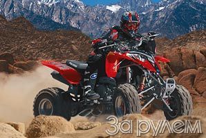 Но хватит дифирамбов - пора опробовать красавца в деле. Если на улице не пойми чего (или так и не начавшаяся зима, или слишком ранняя весна, словом, "бездорожье с элементами грунта и снега"), то так даже лучше: кто сказал, что квадрацикл - игрушка для лета? Динамика такая, что если порезче нажать на газ и при этом не пригнуться к рулю, то рискуешь подняться в "свечу". Что не удивительно: при возросшей мощности машина, как и положено спортсмену, стала значительно легче. Мелкие неровности на дороге Predator просто "не замечает", а крупные "проглатывает", оберегая седока от неудобств. В этом несомненная заслуга хорошо настроенных газонаполненных амортизаторов и кинематики подвески. Не подкачали они и при резком торможении. Аппарат не припадает в характерный для квадрациклов "клевок" при торможении, что позволяет тормозить всеми четырьмя колёсами, а не только загруженными передними. Все это обретает особую ценность, когда, взобравшись на довольно крутой и высокий склон, вам захочется с него спуститься. Оказывается, это совсем просто!