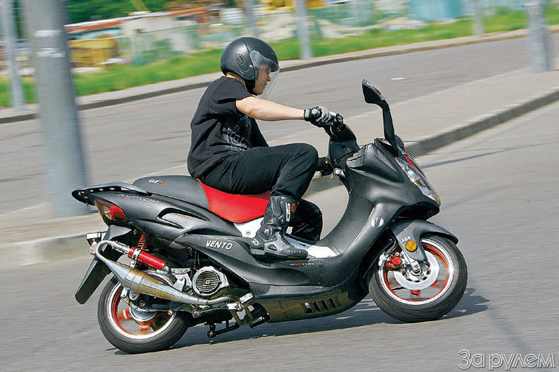 В поворотах «Пантера» «пишет» траекторию безупречно – может показаться, на виражах скутер испытывает такое же удовольствие, как и я. Наклонять аппарат можно очень «глубоко», однако когда чересчур увлечешься, высекающая искры центральная подставка напомнит: «Эй, ты не на спортбайке!». Стабильно едет и по прямой: руль отпускаешь без опаски – и «табуретка» уверенно держит линию. Мотор тяговитый, с устойчивым крутящим моментом. Однако он все-таки здорово «придушен»: максимальная скорость Vento – 90 км/ч. Ускорение деликатно назову удовлетворительным. Есть с чем сравнить: помню, катался на Lifan с двигателем той же кубатуры, так тот и разгонялся живее, и его «максималка» выше – 115 км/ч. Но допускаю, что тихоходность – следствие не конструкторского промаха, а неправильной обкатки. Впрочем, резвость и «крутильную силу» мотора можно проверить еще и так – попробовать «отжечь» резину. Попытки сделать это оказались безрезультатными – силенок у движка маловато. Но держаться на Vento в потоке даже с весьма скромными мощностными показателями мотора не составляет труда. Попутно скажу, автомобилисты его замечают: скутерок выглядит довольно солидно – габаритами не мал. В пробке драйверы уступают дорогу «рейсеру». А ведь будь я на «полтиннике», таких привилегий ни за что не удостоился бы.