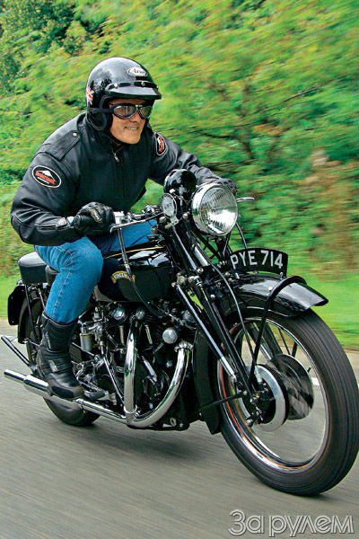 Но прочь воспоминания – вернемся к настоящему. Теперь, после знакомства с этим Black Shadow, должен признать, что просто не дал своему Vincent шанса себя проявить. Вот если бы и я потратил десять лет на его реставрациюѕ У этого экземпляра, в отличие от бывшего моего, мотор запускается с первого тыка, правда, только если он горячий. Найджел сам вызвался прогреть его. С капелькой злорадства, я наблюдал, как он полдюжины раз атаковал кикстартерѕ Впрочем, давайте о приятном. Двигатель тянет с прытью, похвальной даже по меркам XXI века, 4-ступенчатая коробка передач четко переключается (хотя, остановившись, нейтраль находишь с трудом – прямо как на некоторых итальянских мотоциклах). Вот сцепление схватывает очень резко – словно электровыключатель! В результате чего я позорно заглох у светофора. Со вздохом откидываю педаль кикстартера, выжимаю расположенный под левой рукояткой руля рычаг декомпрессора, подвожу поршень к верхней мертвой точке – и все это без особой надежды на моментальный успех. Как же удивился, когда мотор заработал сразу же! Я так разволновался, что пытался стартовать, не убрав подставку. Старый таксист, стоявший позади, наблюдая мою растерянность и суетню, даже не посигналил, чтобы меня подстегнуть.