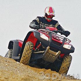Признаться, ожидал, что увижу вездеход с грубыми формами облицовок, а Rincon оказался изящным красавцем. Дизайнеры поработали на славу: острый, но дружелюбный "прищур" фар, плавные обводы пластика, удобно расположенная приборная панель с жидкокристаллическим дисплеем… Все органы управления (кроме селектора направления движения) выведены на руль, привод заднего тормоза продублирован педалью под правой ногой. Для включения переднего моста - переключатель на правом пульте. Здесь и ставшая теперь стандартом комплектации силовая розетка - на случай, если понадобится подключить дополнительное электрооборудование мощностью до 120 ватт, скажем, зарядить телефон, включить фару-искатель, электролебедку или электропилу.