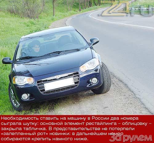 В России предлагают автомобили в комплектациях LE и LX. Двигателя два - рядный 4-цилиндровый мотор 2,0 (140 л.с.) и V6 2,7 (201 л.с.) По умолчанию ставят 4-ступенчатую АКП AutoStick с ручным режимом. С двухлитровым мотором теперь можно заказать и 5-ступенчатую механическую коробку. Правда, к этому, самому недорогому варианту интерес совсем невелик. Собирают заказы и на кабриолет Sebring. Двигатели и трансмиссии те же, а версии - LX и еще более шикарная Limited.