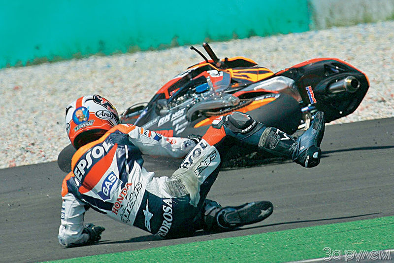 Кстати, если падение у Валентино Росси прошло практически без порчи тела, то Дани Педросе «хайсайд» обошелся несколько дороже – сломал руку, да еще и потерял мотоцикл (Honda вылетела за полотно трассы и сгорела). Испанец все же надеется в марте вернуться в строй.