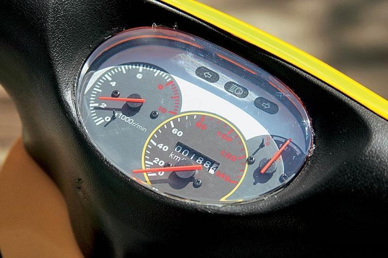 Сразу не заподозрил, что абсолютно новый аппарат из мотосалона уже с подвохом: карбюратор оказался не отрегулированным. Резко открыл дроссель, вернул ручку газа в исходное положение – услышал отчетливый хлопок из глушителя: смесь поступает переобогащенной. Ладно, зато максимальную мощность мотор развивает именно в таком режиме работы карба. Однако упиваться безграничными возможностями мотора не приходится: он просто везет – и не более того. Объем 125 смз предполагает наличие более-менее существенного крутящего момента, способного включить тебя в общий ритм городского трафика. Двигатель, многим знакомый, по сути своей – увеличенная версия QMB139, только с измененной конструкцией масляного насоса и электростартера. А вот он, пускач, заставил напрячься уже после 20 километров, когда после остановки собрался продолжить путь. Нажал на передний тормоз и заветную кнопочку – и ничего не произошло. С самим электродвигателем все нормально – сломалась «нажималка». Насовсем. И в продолжении всего теста приходилось пользоваться киком. Не очень удобно и досадно: ведь вот же она, кнопочка, а приходится дрыгать ногой. Неолит!