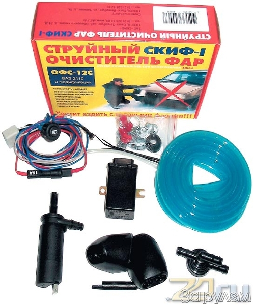 Струйный очиститель фар «Скиф» с итальянским насосом высокого давления, выпускаемый одноименной фирмой из Санкт-Петербурга, подойдет к любой машине. Работой омывателя управляет электронный блок. Две спаренные форсунки идут в комплекте, для каждого типа автомобиля он свой. На «пятерку» нужен корпус повыше, на «десятку» – пониже. Для машин с бампером нестандартной формы есть форсунка с эластичным корпусом. В коробке заботливо уложены хомуты, саморезы, гайки, трубки, провода, уплотнители, клапан-тройник и даже подробнейшая инструкция.