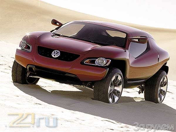 Внешне песчаный концепт похож на Touareg, качественно "усаженный" прессом. Да и начинкой ему не уступит: сумасшедшая V-образная шестерка выдает 241 л.с. и 320 Н*м (2800 об/мин) при поддержке постоянного полного привода 4Motion и АКП Tiptronic. Посадочная формула "2+2" здесь понятие условное: второй ряд сидений устанавливается по мере надобности; в остальное время их место занимает багаж. Экономия места продиктована длиной машины - чуть более 4 метров. Тут уж не до жиру... Чтобы приглушить ощущение тесноты, двери заставили открываться вверх и вбок - элегантное, хоть и не новое, решение.