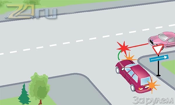 Комментарий юриста «За рулем»: «Многим это может показаться странным, но виноват в этом ДТП Василий. Он выезжал с второстепенной дороги, а потому был обязан руководствоваться требованием знака 2.4 («Уступите дорогу») и должен был пропустить все транспортные средства, движущиеся по главной дороге. Люба, конечно, нарушила требования знака 3.1 («Въезд запрещен»), однако вины в аварии на ней никакой не будет. Она ехала по главной дороге, хоть и против движения. Кстати, такое же столкновение могло произойти, если бы Люба двигалась в том же направлении, но только задним ходом. На дороге с односторонним движением это разрешено Правилами. Так что Василий виноват целиком и полностью. Смотреть надо во все стороны».