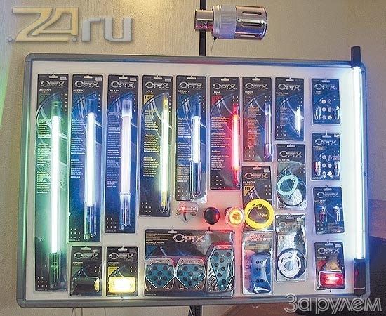 Кроме уже знакомых неоновых подсветок нам показали новые, светодиодные, особо яркие и «особо прочные» – не боятся вибраций, ударов и воды. Ставить такую иллюминацию можно где угодно. Снаружи – под днище, на дворники, жиклеры, колеса (колпачки). Для продвинутых есть забавные светящиеся антеннки. Салон вообще можно превратить в гномье царство: рамка для магнитолы, ручки КП, двери, отдельные плафончики для потолка и пола, плюс светящийся шнур, которым можно обвить все остальное. Мало того, разработчики придумали для своих подсветок две новые функции – мультицветность (можно менять цвет свечения) и подключение через блок, заставляющий лампочки мигать в такт музыкальному ритму.