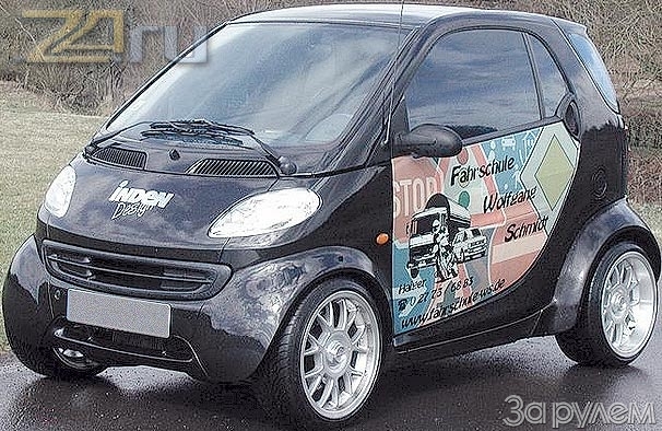 Солидно для таких масштабов поработали и с внешностью машинки, оснастив ее пластиковым стайлинг-пакетом и новыми оптическими элементами. На борта нанесли рекламу фирмы. В остальном Smart стандартен, что вполне соответствует традициям германского тюнинга.