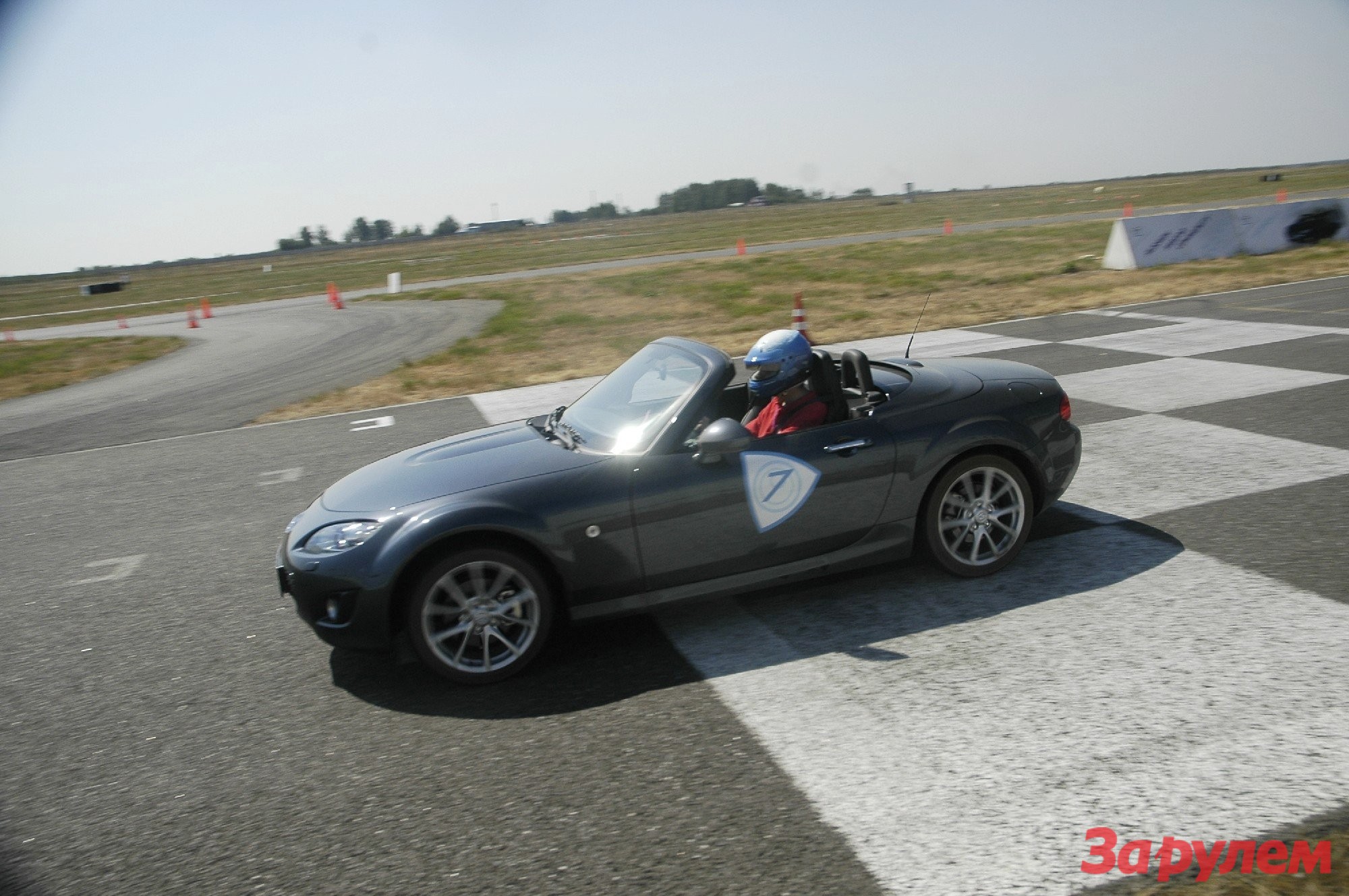 В отличие от езды по городу в Мячково подвеска Mx-5 не показалась достаточно жесткой. В поворотах машина кренится, информируя вестибулярный аппарат, однако, до последнего цепляется за асфальт. В критических режимах развивающийся занос легко корректируется. Система стабилизации срабатывает только после активных действий рулем, позволяя немного поскользить задней осью. Вопреки сомнениям к тормозам вопросов не возникло, все машины с честью выдержали множество заездов.