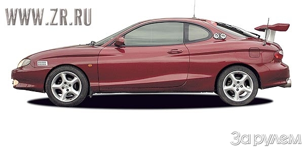 На крыше – система антенн (опять намеки на социальный статус?). Теперь эти прутья ни к чему. Так же ни к чему и нашлепки на кузове: те, что на передних крыльях, изображают воздухозаборники, на задней стойке – имитируют заливную горловину спортивного бензобака. И полосы по кузову смотрятся странновато – ведь у Hyundai Coupe с легендарными спорткарами типа Dodge или AC Cobra нет ничего общего. Под капотом стоит средних размеров фильтр JR – единственное, что относится к области внутренних доработок.