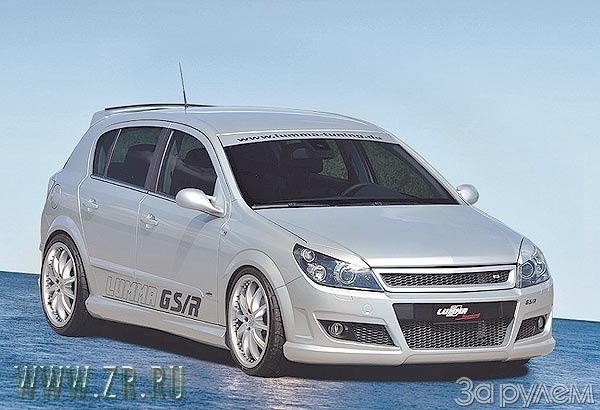 В полном облачении Opel Astra H GS/R Lumma Tuning выглядит так. Спереди стоит спойлер ценой 490 евро и решетка радиатора за 138. Накладки на фары, "реснички" - еще 49. Пара зеркал с электроприводом - 390. Накладки на арки - 274 евро за комплект. Если судить по виду, без них стайлинг-комплект будет выглядеть просто бедно. А вот без спойлера на крышу (169 евро) можно было бы обойтись, если бы не одна полезная функция - дополнительный стоп-сигнал. Если уж мы поставили спойлер спереди, придется подумать насчет накладки на задний бампер - 249 евро. В нем предусмотрены вырезы под нештатную выхлопную систему стоимостью 687 евро. И совершенные мелочи: накладки на пороги за 54 и "реснички" на задние фары за 39.