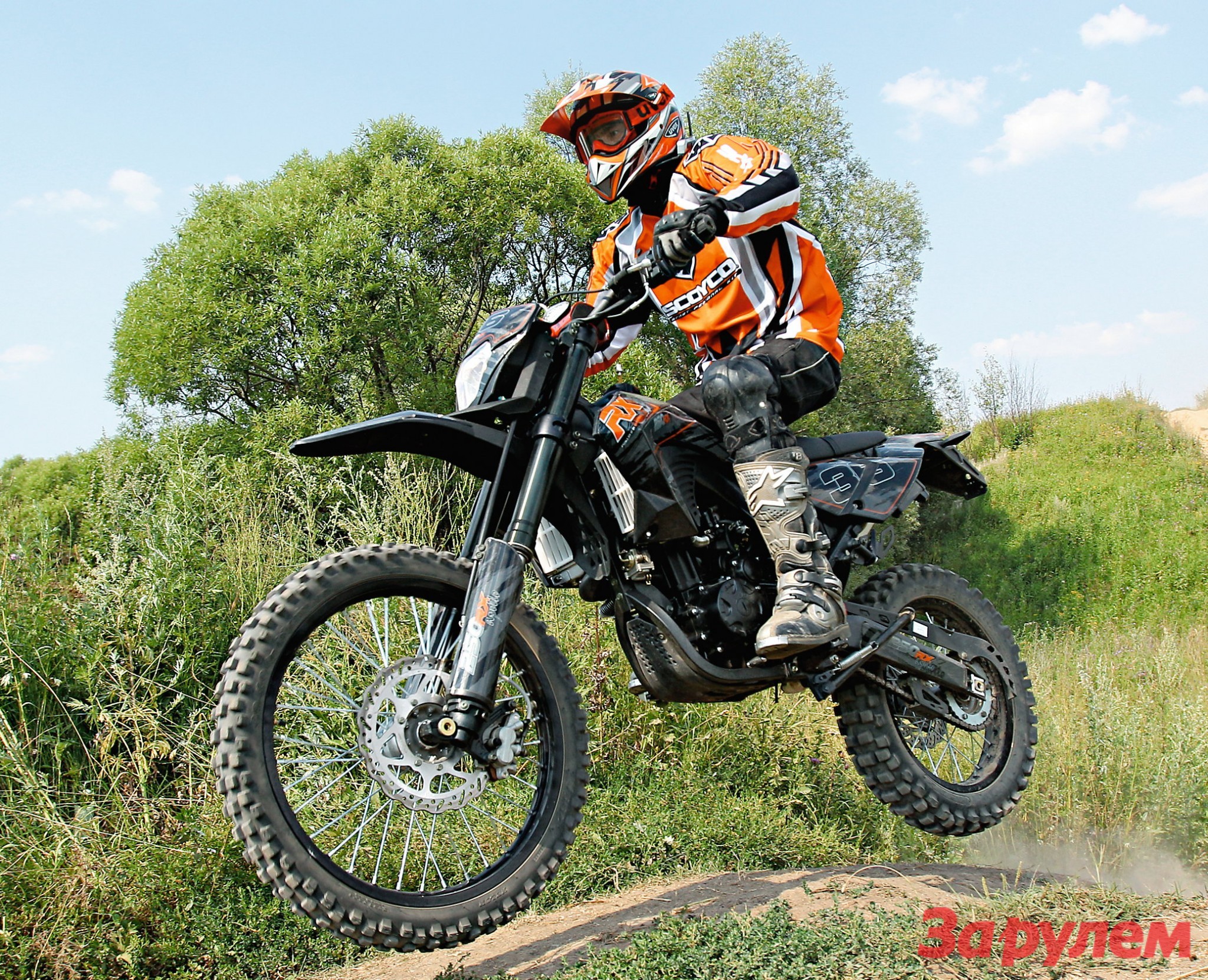 Мотоцикл неплохо карабкается на подъемы, прыгает через поваленные деревья, но чащи и колеи ему противопоказаны – из-за слабо защищенных радиаторов и лапок. Зато испытание жарой он выдержал с честью. Хоть вентиляторы и работали почти беспрерывно, мотор не перегрелся даже после езды по раскаленной пашне.