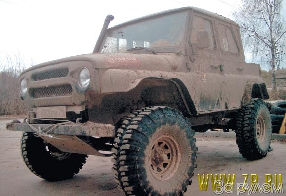 Первыми бросаются в глаза огромные «зубастые» шины наружным диаметром 38 дюймов и значительно модифицированный кузов. А может, он и не кузов вовсе – попробуй, подбери ему точное определение, когда его самого вроде и нет! Так что не мудрствуя лукаво обзовем его пикапом: позади задних дверей смонтировали перегородку, вырезанную из задней части обыкновенного цельнометаллического УАЗ-31519. Причем заднее стекло может открываться: это же верхняя створка багажника старых «уазиков»! Кузов разделен по высоте на две независимые секции: в нижней установлен самодельный 200-литровый топливный бак, в верхней разместили запаску, лопаты и буксировочные тросы. А для реечного «Хай-Джека» – непременного атрибута любого настоящего джипера – нашлось место на заднем откидном борту.