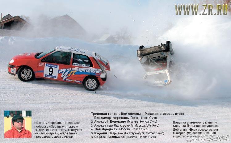 Призы «Всех звезд-2005» разыграли в элитарном и пока не особо массовом зачете N-1600 (иномарки на шинах Black Rocket с шипами 1,5 мм). С трудом наскребли 16 участников - необходимый минимум для проведения классической трековой гонки по системе «16 заездов по 6 машин». Под определение «все сильнейшие» не попадала примерно треть пилотов и, собственно, никто из «темных лошадок» лавров не добился. А вот дров наломали порядочно - к концу состязаний из строя полностью вышли три автомобиля. Еще один, Citroen Saxo семикратного победителя «Звезд» Сергея Успенского, часа за полтора восстановили из небытия ценой героического труда на десятиградусном морозе с помощью трех рулонов скотча.