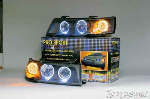Итак, по порядку: блок-фары фирмы PRO.SPORT - правая и левая, каждая выполнена в едином корпусе с поворотником. Габаритные огни в виде кольцевых светодиодов - наш ответ БMВ. Правда, не совсем наш: эксперты предположили, что фары эти произведены в КНР. Любоваться ими, позабыв о цене, можно долго - смотрятся круто! А вот результатами испытаний эксперты из НИИАЭ были, мягко говоря, шокированы: после "знакомства" последовало жесткое заявление - установка блок-фар фирмы PRO.SPORT на автомобиль недопустима!