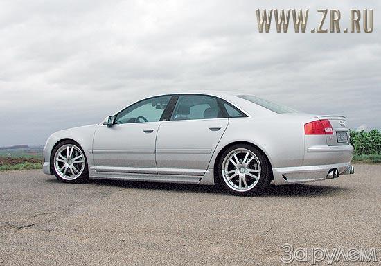 Профиль A8 доработан лаконично: накладки на пороги с вентиляционными отверстиями. Этого вполне достаточно, чтобы массивный седан стал более приземистым на вид, а значит - стремительнее и спортивнее.