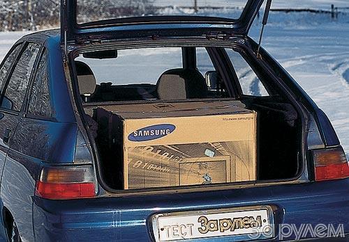 Но вот ему предложен предмет покрупнее - телевизор. Увы, седан для его перевозки мало пригоден. Как выяснилось, стандартная коробка от 21-дюймового монитора не входит не только в багажник, но и в салон. Как мы ни исхитрялись - ничего не получилось. Так что в реальной жизни выхода два: либо багажник на крышу, либо "голый" телевизор без коробки. Обидно, тем более что такая тара без проблем влезла в салон куда более скромного по размерам " Рено Клио". А вот остальные тестовые предметы уместились в салон и багажник седана без проблем. Придраться можно разве что к выступающему над бампером ребру, увеличивающему погрузочную высоту. Удобно класть в "десятку" и длинномеры. Не надо раскладывать сиденья - открыл специальный лючок и просунул в него лыжи и прочую негабаритную дребедень.