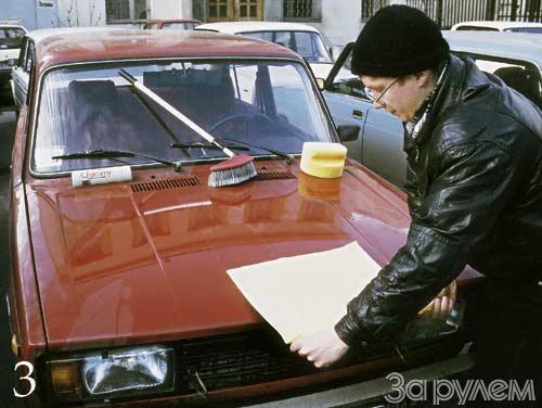 Мокрый автомобиль нужно просушить, и не только в мороз, спасаясь от льда в замках, но и летом. Машину вытирают, чтобы, во-первых, предотвратить разводы, остающиеся от жесткой воды (следы солей), и, во-вторых, располировать шампунь. Лучшее средство - искусственная замша: и полирует хорошо, и пыль, если она еще осталась, в себя вбирает. Можно использовать мягкую тряпку. Технология - как при мытье полов в казарме: развернутую тряпку кладем на поверхность и тянем за край, потом переворачиваем - и еще раз (фото 3).