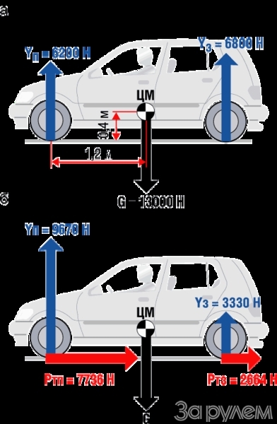 Нагрузка на ось - вещь серьезная. Положим, автомобиль массой 1300 кг весит (округлим) 13 000 Н - и, пока неподвижен (рис. а), на переднюю ось приходится 6200 Н, а на заднюю - 6800 Н. При торможении (б) картина другая. Например, при интенсивном, с замедлением 8 м/с2, передняя ось "догрузится" аж до 9670 Н! Задняя же разгрузится до 3330 Н (в). Все просто - и для случая, когда тормозят все колеса, задача легко решаема. Конечно, чем меньше замедление, тем слабей перераспределение нагрузки.