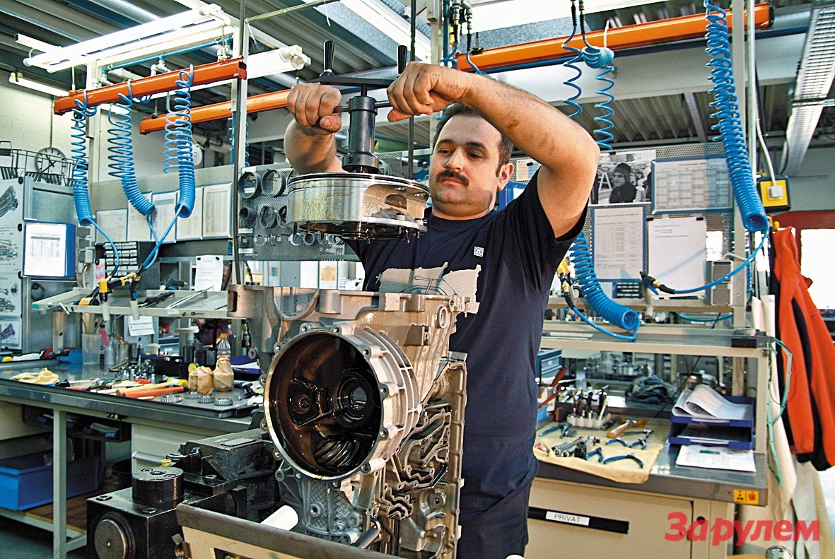 Механизация проникла на несколько участков: очистки корпусов, заправки отреставрированных коробок трансмиссионной жидкостью, стенд финальных испытаний под нагрузкой. Остальное делается вручную – АКП разбирают до последней шестеренки в планетарном механизме, детали придирчиво дефектуют. Труд нелегкий физический (попробуйте потягать за смену тяжелые валы и редукторы), при этом требует глазомера часовщика. Но точная механика – немецкая стихия. Видели бы вы просветленные лица мастеров, работающих с нескрываемым удовольствием! Прежде чем начать сборку, внутренности коробок отмывают до первозданного блеска. В обязательном порядке меняют прокладки, уплотнители, фильтры, все мало-мальски изношенные детали. Если какой-то узел после запуска коробки в серию пережил заводской тюнинг, то имплантируют его усовершенствованный вариант. На финише получают АКП, практически не отличимую от сошедшей с заводского конвейера, и с той же двухлетней гарантией.