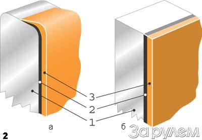 Если такое зеркало найти не удалось, можно вполне обойтись и обычным, но сделанным по установленной производственной технологии. На специализированных предприятиях заготовки автомобильных зеркал вырезают из стеклянного полотна, шлифуют острые кромки и затем покрывают слоем металла: осаждают серебро или напыляют алюминий. И только после этого на образовавшуюся тончайшую металлическую пленку наносят защитный лак, обрабатывая и торец стекла (рис. 2 а) - вот такое зеркало прослужит долго. Когда же в качестве производителей выступают халтурщики (сегодня многие норовят заработать на ширпотребе), ни о каком напылении не идет и речи: они просто закупают мебельные зеркала и, орудуя стеклорезом, придают заготовке "нужную" форму. При этом торец стекла остается открытым (рис. 2 б), и уже через год влага сделает свое черное дело - зеркало облезет по краям.
