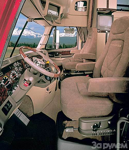 Любовь американских дальнобойщиков к грузовикам "Фрейтлайнер" легко разделить, заглянув в кабину "Коронадо". Оформление "квартиры" - царское: древесный шпон, двухспицевый руль отделан хромом, сиденья и стены спального отсека обшиты кожей.