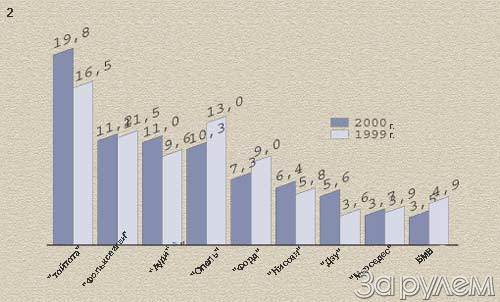 Чтобы оценить перемены в парке иномарок, обратимся к постоянно пополняемой и обновляемой базе данных ЗР (диаграмма 2). Картина, естественно, очень похожа на ту, что написана кистью таможенников. В первых рядах все те же знакомые имена. Следом за "Тойотой" расположились особо почитаемые россиянами "немцы". Но их число заметно сокращается.