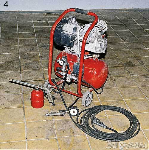 Другое дело автосервис, пусть даже небольшой. Или дружная автостоянка, где в общем пользовании имеется кое-какой серьезный инструмент. Здесь уже без воздуха, извините, как без рук. Пневматический инструмент компактнее электрического (отсутствует электромотор), безопасней (по той же причине), а возможностей у него не меньше - гайковерты, дрели, ножницы, зубила и тому подобное (фото 1-3). Окрасочное оборудование без сжатого воздуха и представить трудно. Все это хозяйство работает при давлении воздуха атмосфер восемь, не меньше, - без компрессора не обойтись.