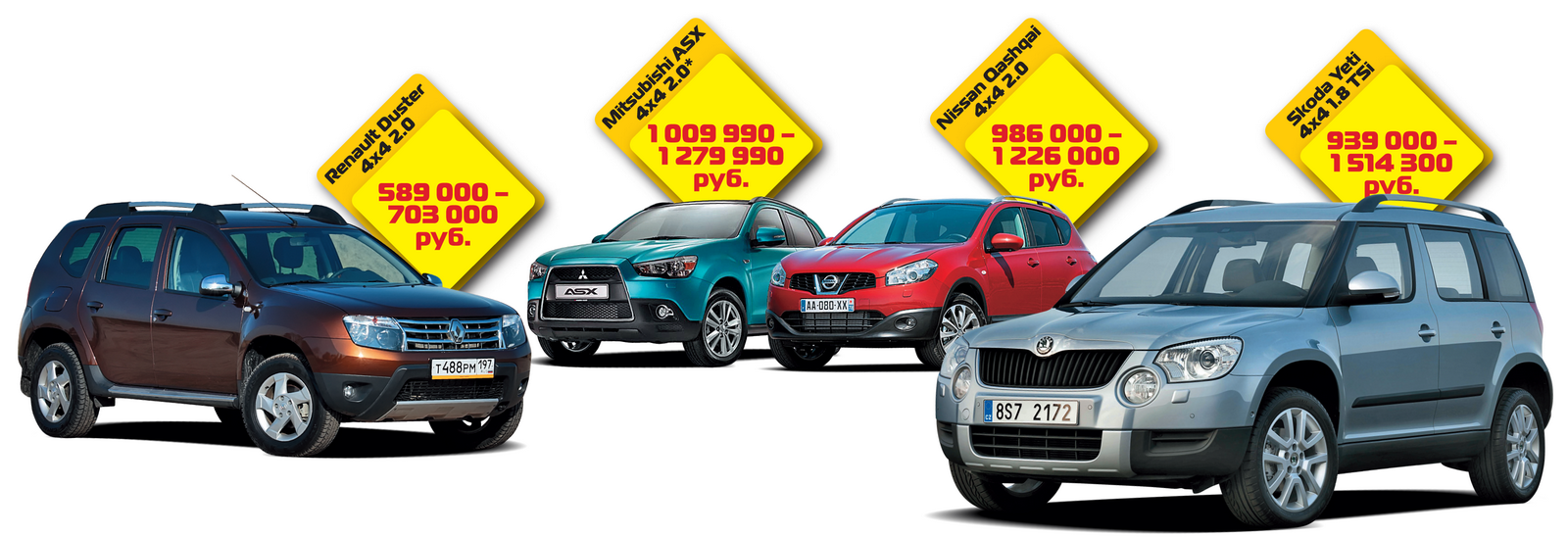 Чтобы уравнять стартовые позиции конкурентов, мы отобрали для сравнительного обзора полноприводные модификации паркетников с бензиновыми моторами близкой мощности. Это атмосферные аг­регаты 2.0 в случае Renault Duster, Nissan Qashqai, Mitsubishi ASX и турбодвигатель 1.8 TSi у Skoda Yeti. Самую дешевую путевку в мир кроссоверов предлагает Renault Duster. За версию Expression (начальную для мотора 2.0) дилеры просят 589 000 руб. К сожалению, полноприводной модификации Duster отказано в коробке-«автомате». Доступный Expression предсказуемо обделен многими бла­гами, так что желающим не вступать на стезю аскезы придется доплачивать за кондиционер и подогрев передних сидений. Skoda Yeti ощутимо дороже дискаунтера Duster. Цены на «снежного человека» стартуют с отметки 939 000 руб. Комфортная составляющая на прием­лемом уровне: кондиционер, подогрев передних сидений. У Yeti самые впечатляющие возможности апгрейда за счет обширного набора дополнительных опций. Nissan Qashqai предлагает наибольшую гамму версий – целых шесть, однако две из них, SV и LE+, доступны исключительно для модификаций с вариатором. Базовый вариант экипировки XE за 986 000 руб. вполне самодостаточен в плане ком­форта и обладает отличным спасательным и контраварийным набором. Прайс-лист на полноприводную разновидность Mitsubishi ASX перешагнул миллионный рубеж, но сюда уже включена ав­то­матическая трансмиссия – все версии 4WD с мотором 2.0 снабжены вариатором. Оснащение Invite во многом сходно с начальной экипировкой Skoda Yeti, предлагая к тому же аудиоцентр, задние электростеклоподъемники. Но душок скаредности есть, от него избавляет переход на более дорогие ступени.