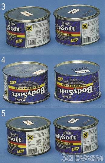 3. Полиэфирная шпатлевка "Бодисофт" - фальшивка слева, оригинал справа. Жулики то ли не смогли, то ли забыли воспроизвести отчеканенную на крышке надпись "HB BODY".
