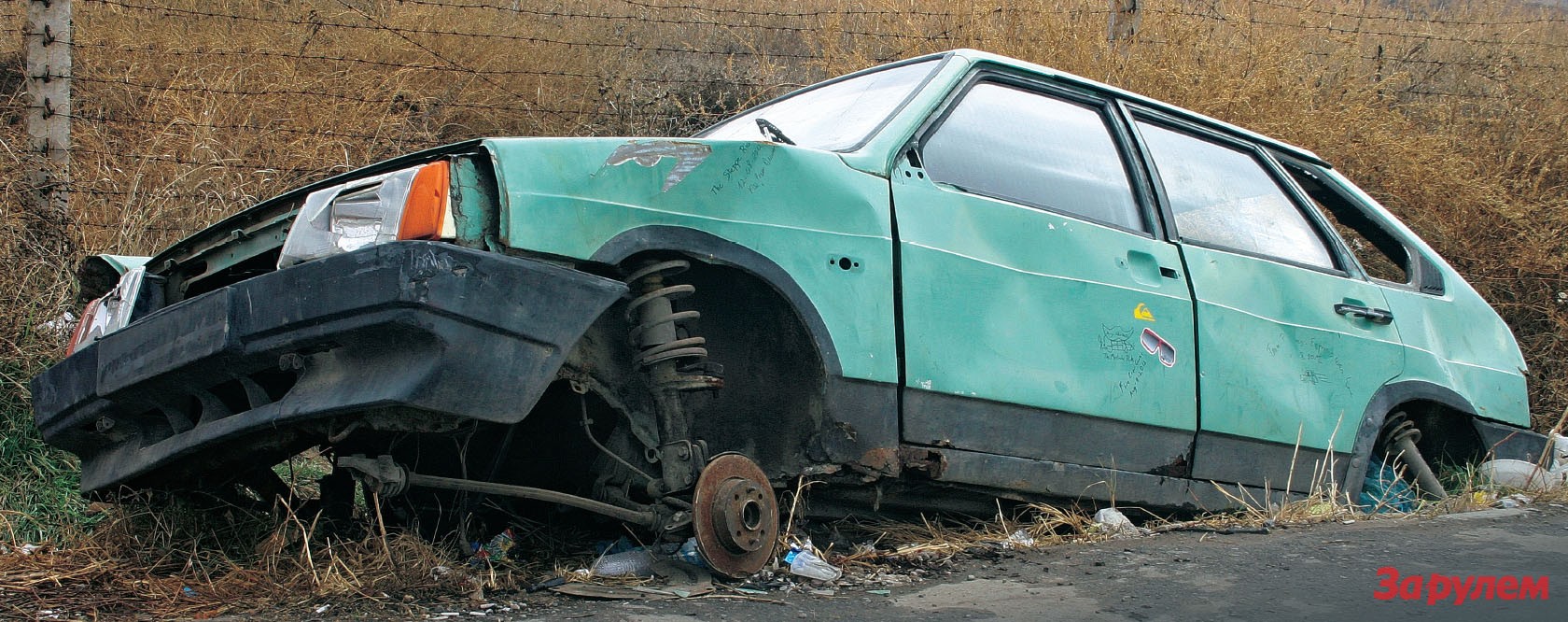 Эта «девятка» находится на нейтральной полосе, совсем рядом со въездом на территорию Казахстана, если ехать со стороны Ташкента. Эта «девятка» без колес, мотора и половины деталей блестяще символизирует собой таможенный союз трех стран – Казахстана, России, Белоруссии.