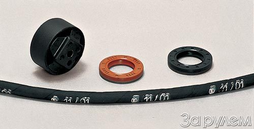 На заднем плане справа - сальники полуоси 2110-2301034 и 2110-2301035: соответственно правый и левый. Правый - черного цвета, левый - красно-коричневый: при монтаже их не перепутаешь. Полуобрезиненный каркас и волнообразные рифы по наружному диаметру улучшают монтажные свойства сальников и обеспечивают герметичность узла. Имеются также маслосгонные насечки по рабочей кромке и пыльнику. Цена, мягко говоря, странная - всего лишь 7 руб. 50 коп. за штуку. Неужели сальник настолько проще шланга?