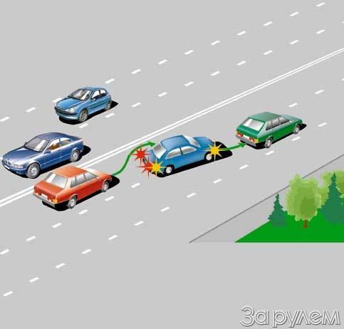 В этой ситуации способна спасти только мгновенная реакция "преследователя", причем реагировать ему надо в первую очередь рулем, пытаясь объехать внезапное препятствие, благо большая часть полосы все-таки уже свободна. Не допускайте подобных ошибок сами и будьте готовы к подобным "непредумышленным подставам" со стороны других: прежде чем надавить на педаль акселератора, дождитесь, пока следующий впереди водитель освободит полосу движения полностью.