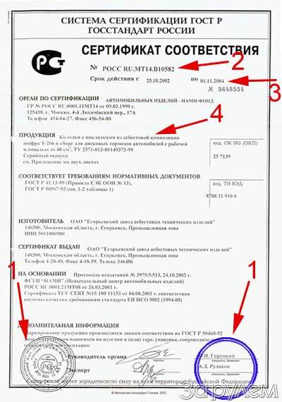 Взгляд первый - на печати (1). Их должно быть две: ксерокопированная - органа по сертификации и натуральная ("мокрая") - владельца сертификата (что копия, значит, верна). Взгляд второй - на номер сертификата (2). Он выглядит, например, так: РОСС RU.MT14.В10582. Здесь МТ14 - код органа по сертификации (в данном случае "НАМИ-Фонда"). В России сейчас более двадцати органов, которые вправе сертифицировать автомобильные изделия.