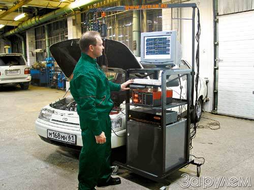 Он способен контролировать и выдавать до 1000 различных параметров (если в этом будет необходимость), совместим с ЭБУ всех отечественных марок и многими зарубежными. В режиме мотор-тестера может детально обследовать состояние двигателя и его систем. По существу, речь идет о целом диагностическом комплексе на передвижной стойке, позволяющем работать практически с любыми автомобилями с бензиновыми двигателями - от карбюраторных до новейших с современным микропроцессорным управлением и статическими системами зажигания. Мощный шлейф проводов связывает специальные датчики, устанавливаемые на автомобиль, с функциональным блоком. Информация выводится на экран компьютера и принтер.